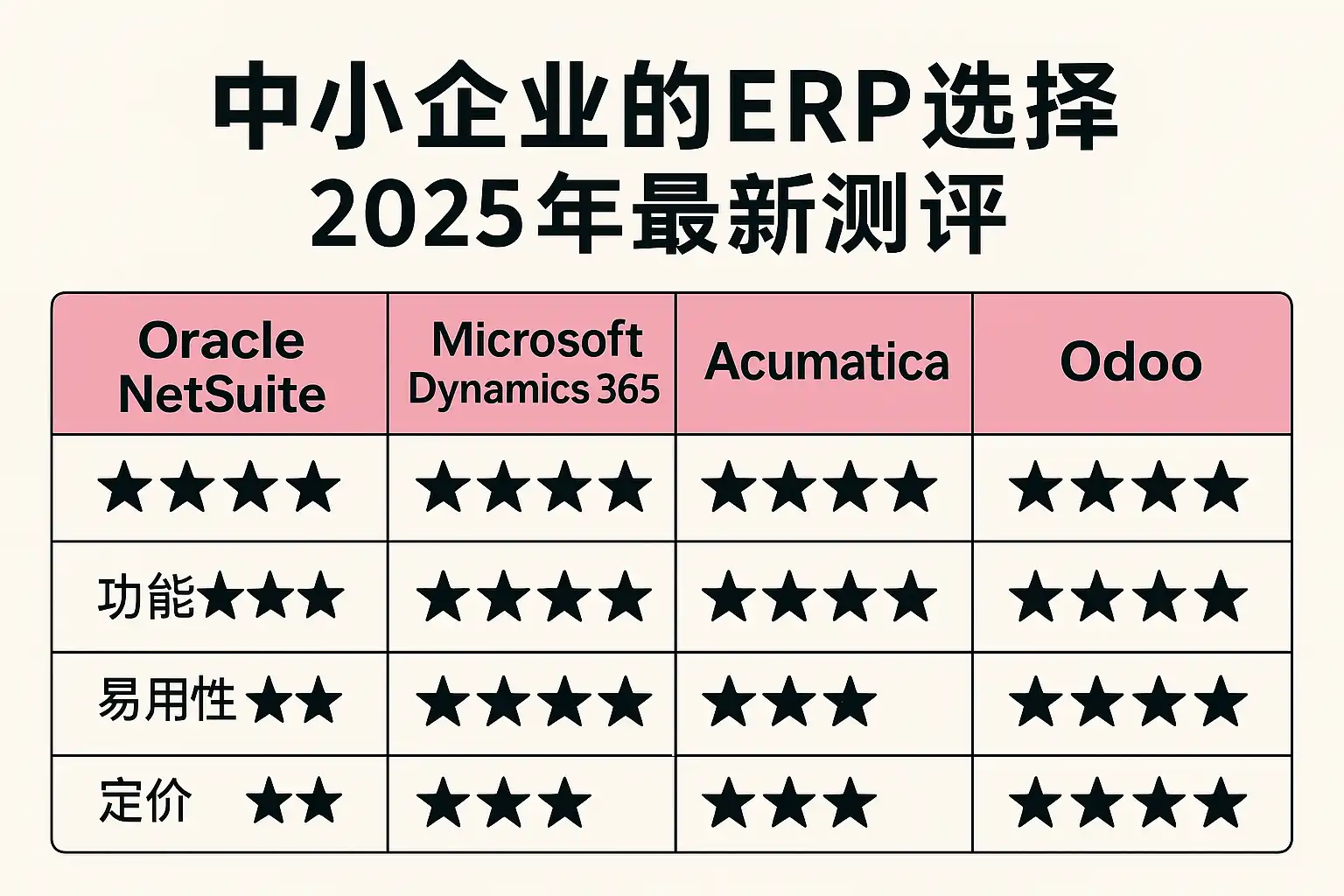- 跨境电商/多币种优选:Oracle NetSuite(预算较高)、Odoo企业版(性价比高)。