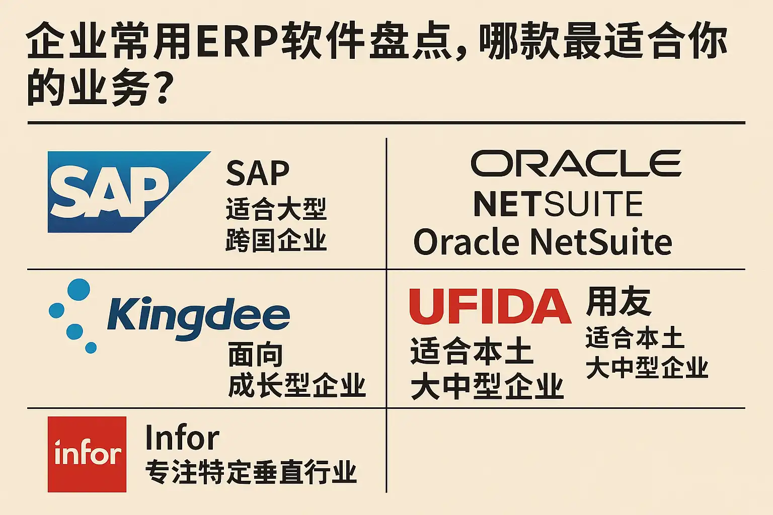 - 国际化与集团:SAP/Oracle在多法人合并、全球合规最稳健。