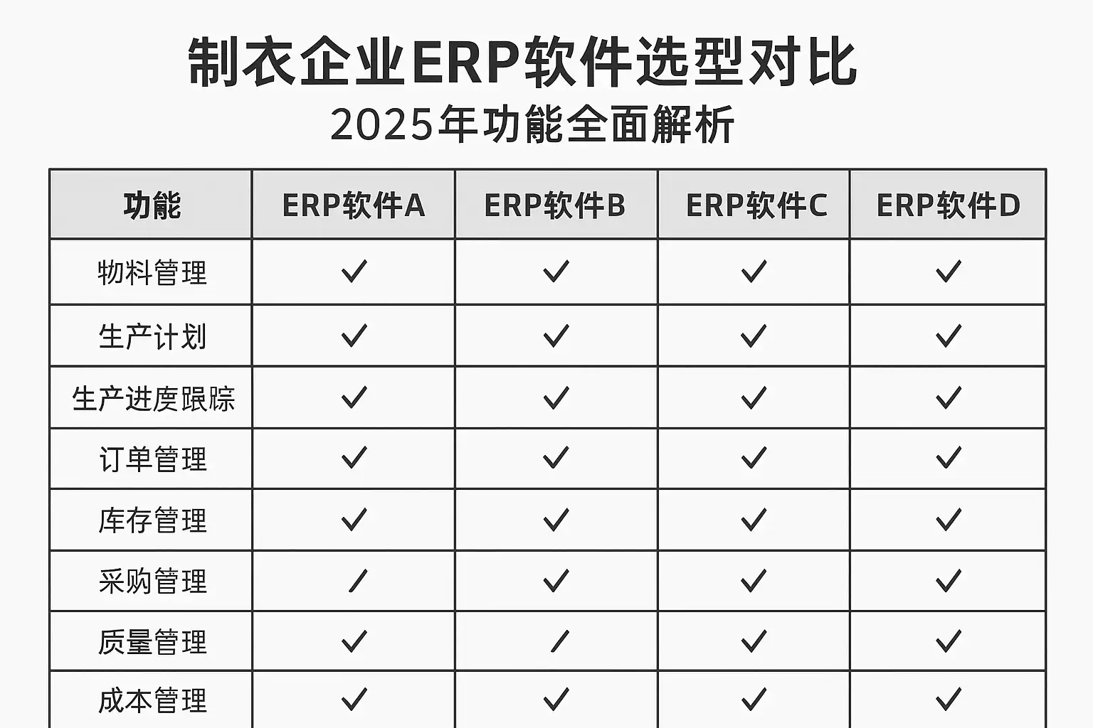 制衣企业应基于企业规模和业务复杂度,采用以下功能对比维度判断ERP适配度: