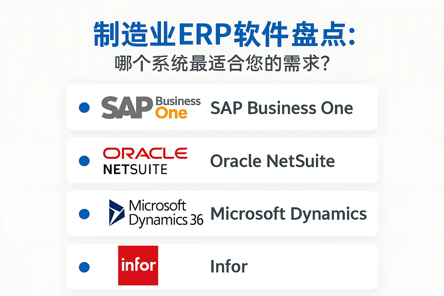 - 集团与全球化:SAP S/4HANA或Oracle NetSuite;