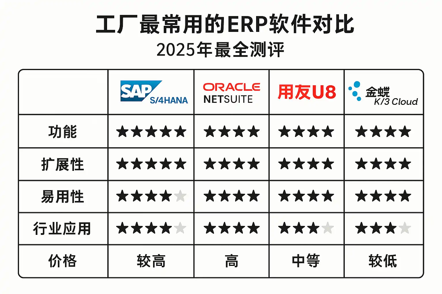 下表汇总主流ERP在制造场景的整体表现,便于快速定位: