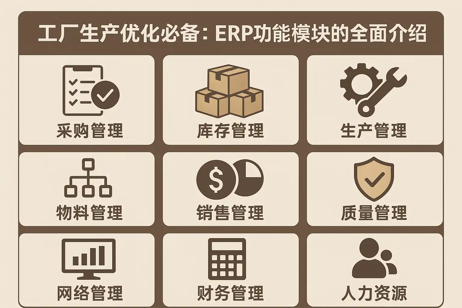 以下为典型ERP模块与工厂价值点映射,便于选择与组合实施。