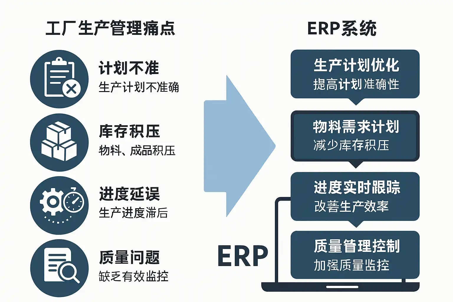 | 痛点 | 具体影响 | ERP功能模块 | 关键做法 | 预期收益 |