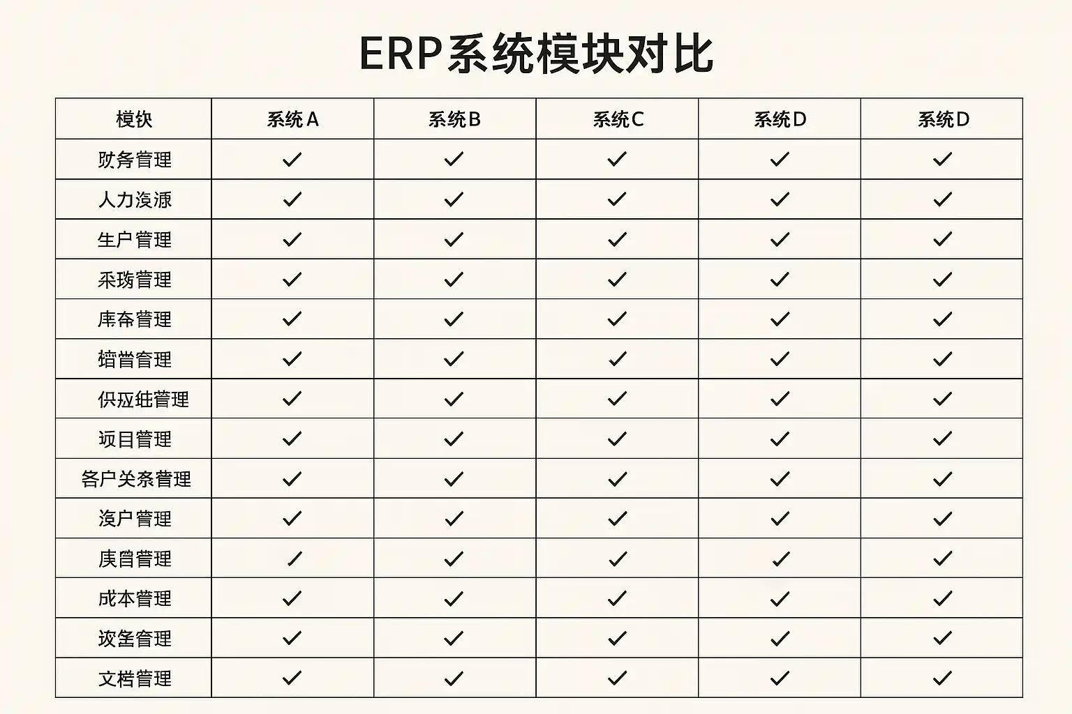 不同厂商ERP系统的模块功能存在差异,以下为常见核心模块的对比总结: