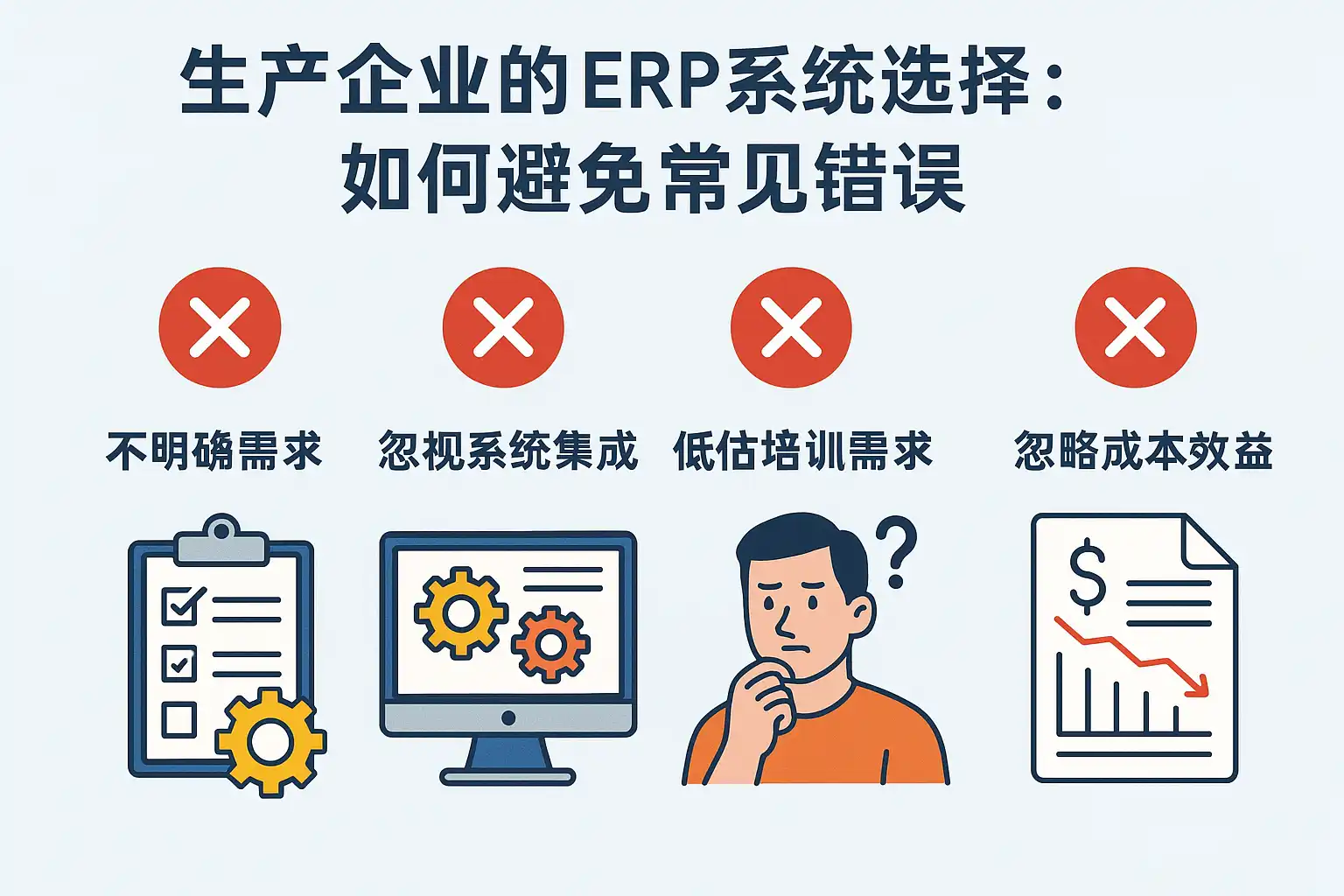 作为一名生产企业管理者,我发现ERP系统选择过程复杂且容易出错。比如功能不匹配或实施失败,我该如何避免这些常见错误,确保ERP系统真正提升企业效率?