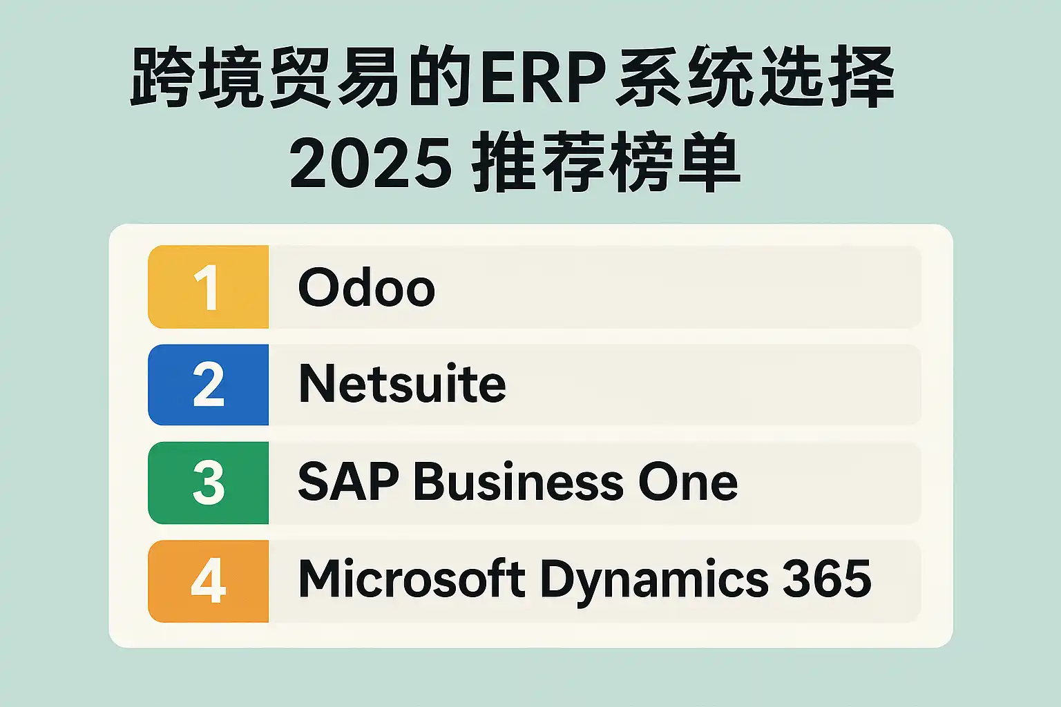 结论:跨境贸易ERP不存在“一刀切”。按规模与复杂度建议:1、Oracle NetSuite(全球跨境/多币税全能)、2、SAP Business One(制造/批发深度)、3、Microsoft D365 BC(成长型与生态)、4、Odoo企业版(成本敏感与灵活)、5、简道云ERP系统(低代码快速定制)。如需快速上线与更强自定义,优先5;重视全球合规与深财务,优先1。