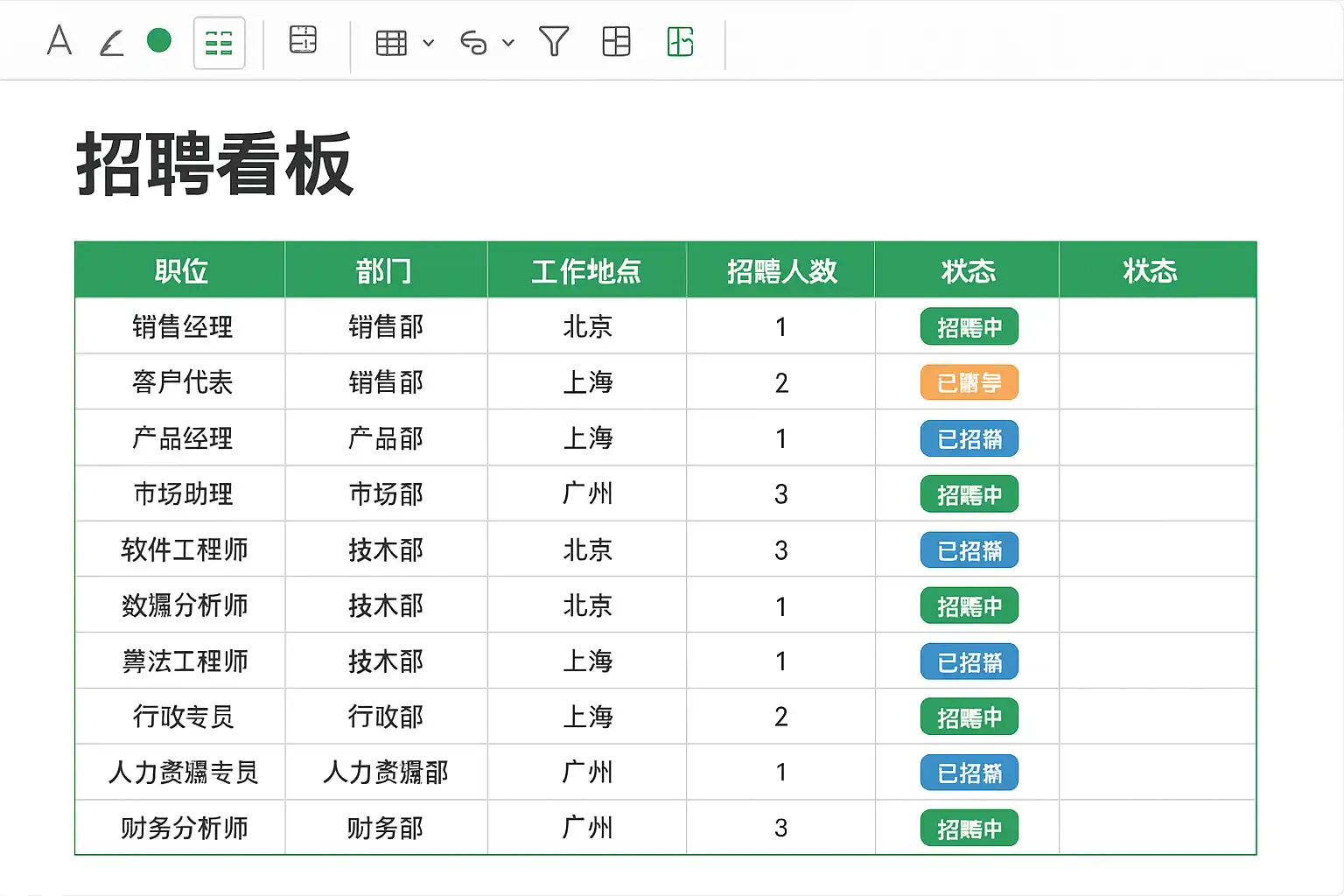 - 采用表格/看板方式直观展示各岗位及候选人当前状态。