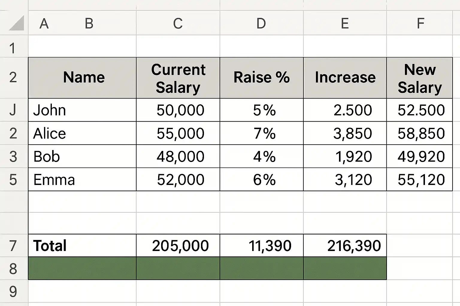 - 利用公式自动计算加薪金额 = 当前工资 × 加薪比例