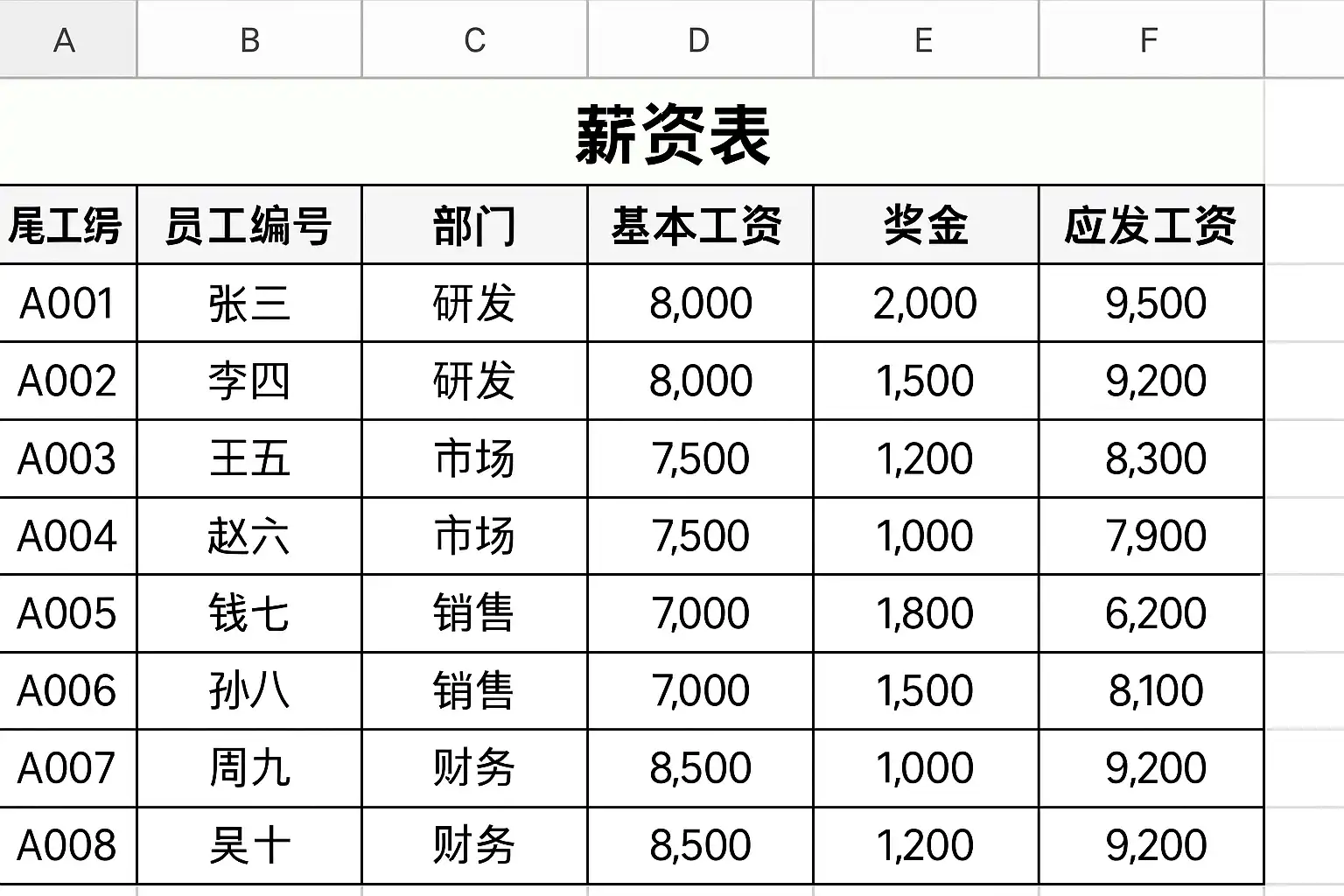 | A001 | 张三 | 财务部 | ¥8000 | ¥500 | ¥200 | ¥1000 | ¥600 | ¥300 | [公式] |