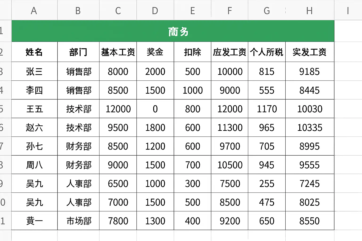 | 员工编号 | 姓名 | 部门 | 基本工资 | 津贴 | 奖金 | 社保 | 税收 | 实发工资 |