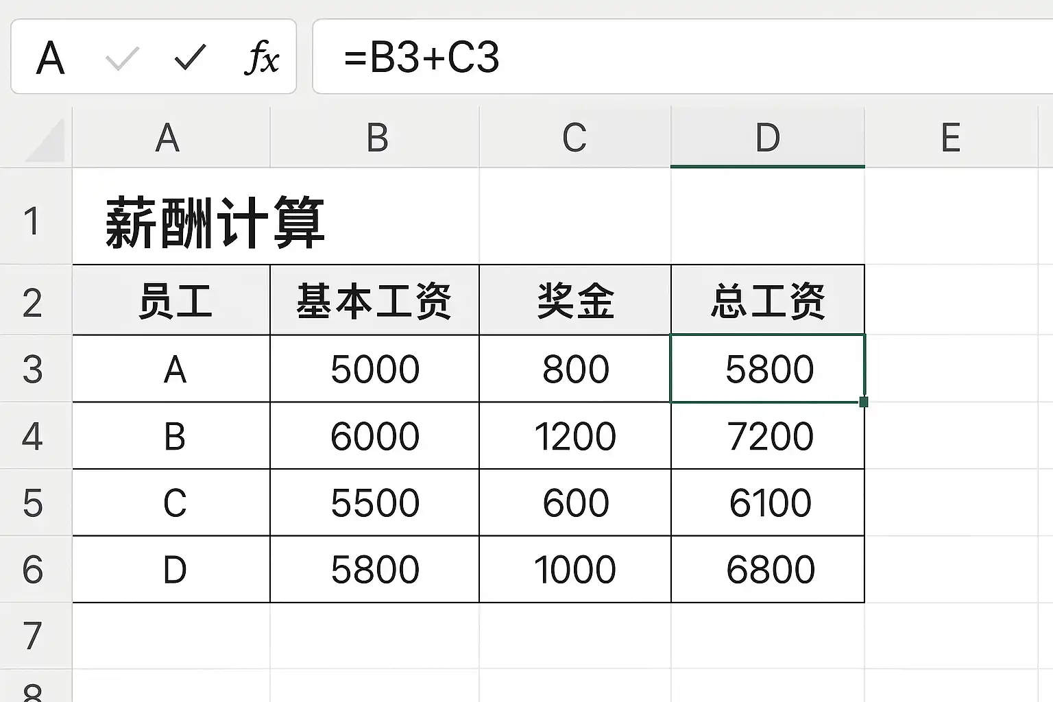 | 张三 | 5000 | 800 | 200 | 300 | -600 | -400 | =SUM(B2:E2,F2:G2) |