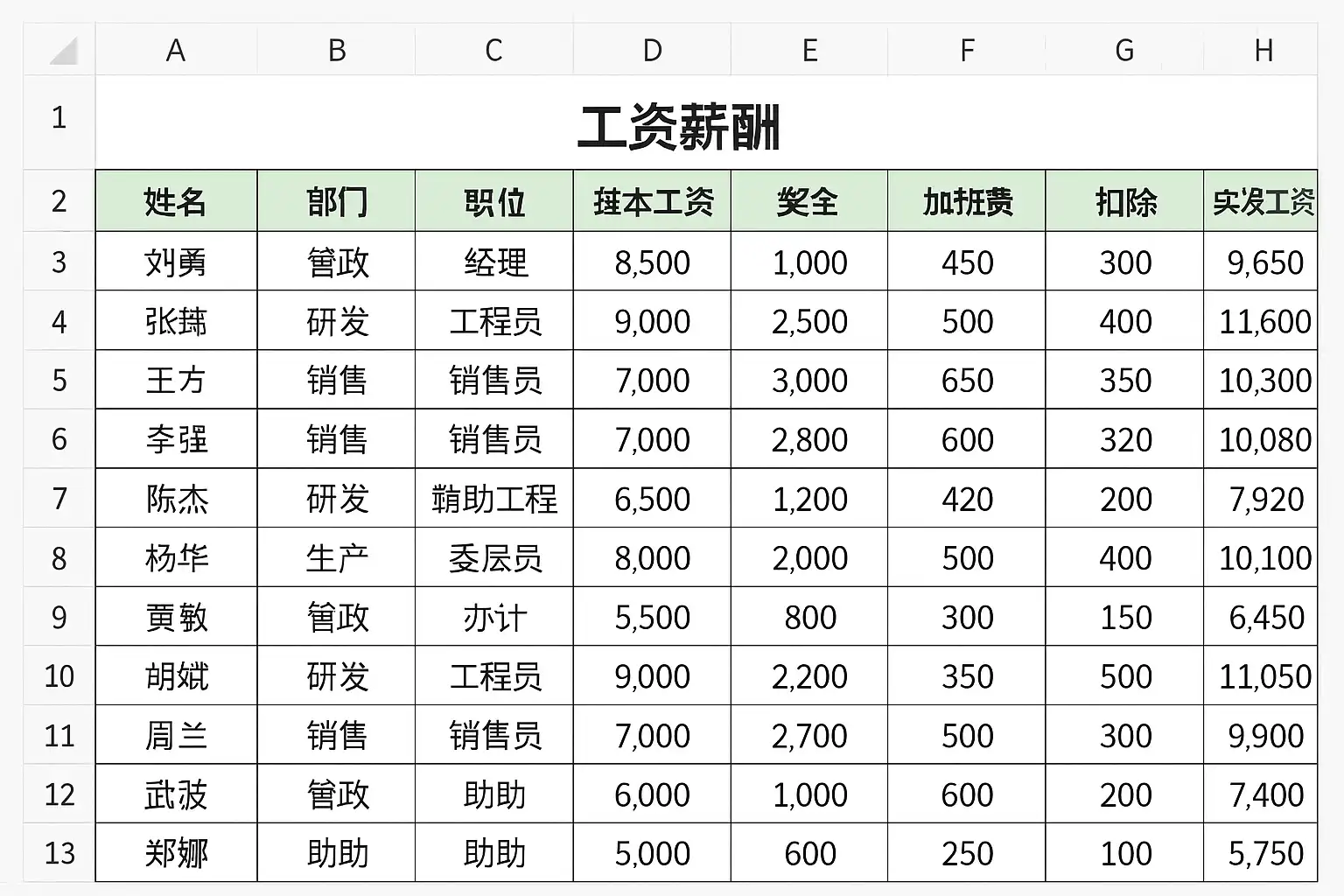 - 设计基础框架:包括员工姓名、职位、基本工资、奖金、扣款和实发工资等列。