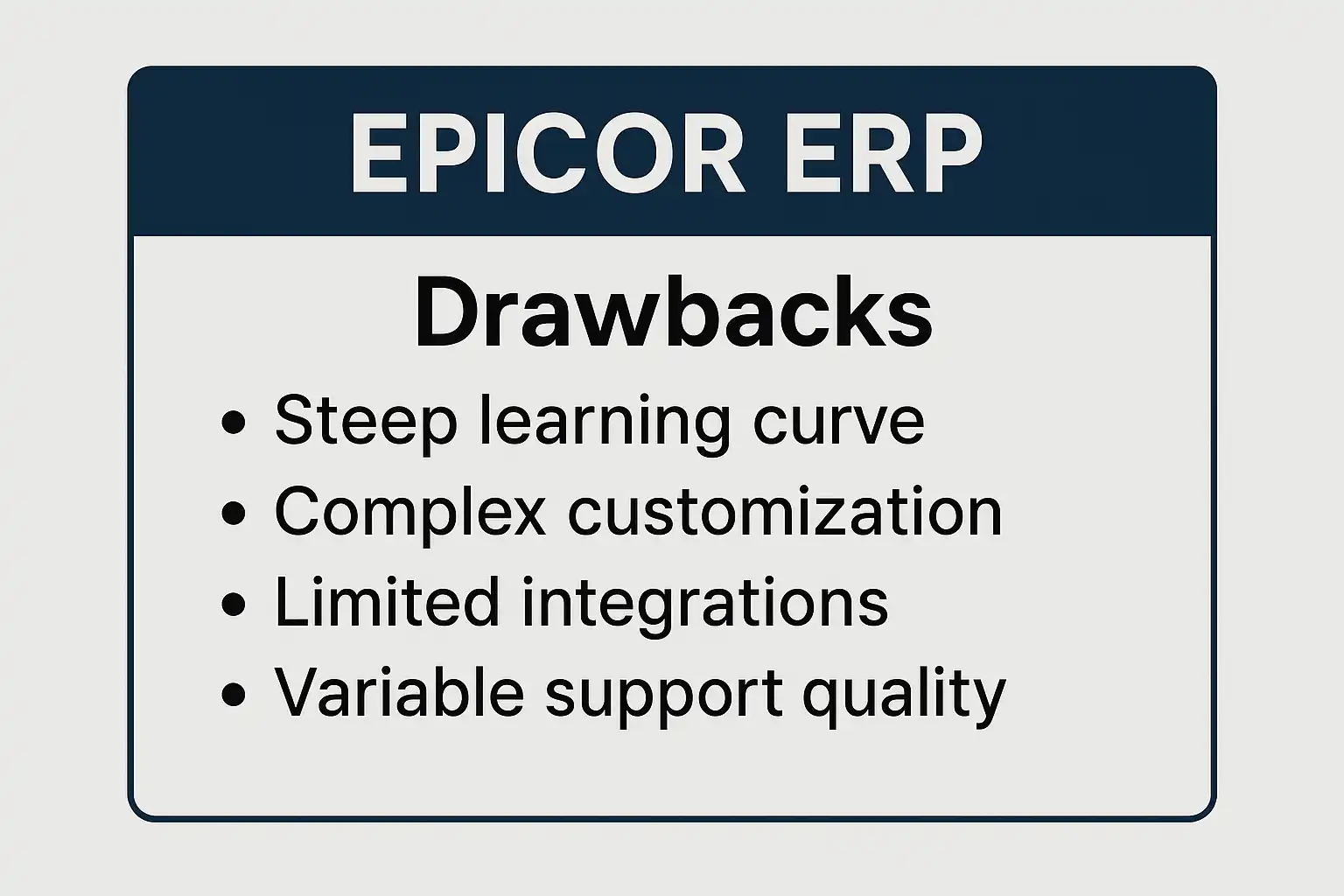 我在考虑实施Epicor ERP系统,但听说它有一些缺点。具体来说,Epicor ERP有哪些主要问题可能会影响企业的运营效率?