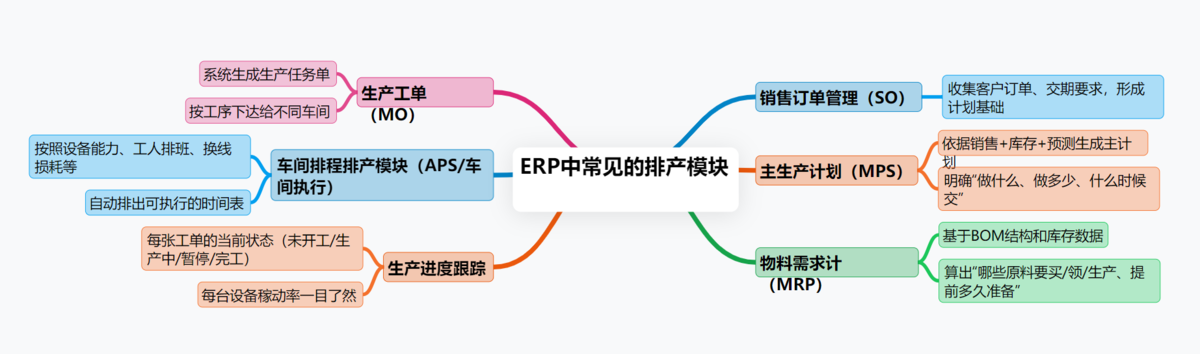 特别是对于制造企业来说,ERP系统通常具备这几个核心排产相关模块: