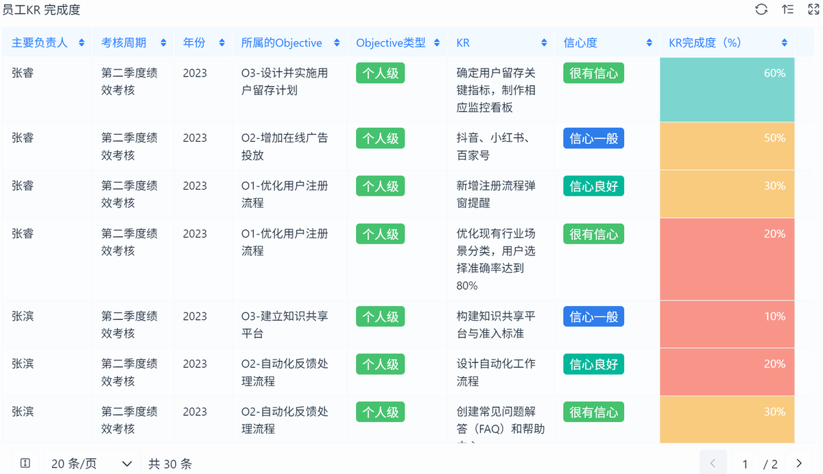 - Objectives 与 KRs 用于查看已有目标和 KRs,并让相应的负责人在表单中更新目标进度。