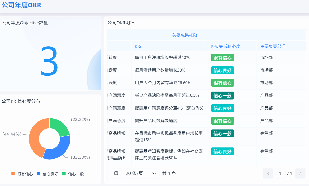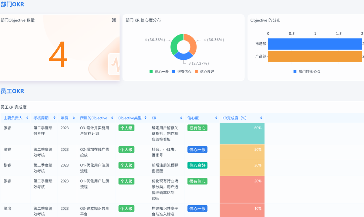 - 期初进行 OKR 设置,优先设置公司年度目标,并拆解 KRs,而后部门对齐公司目标制定部门 OKR,员工对齐部门与公司目标制定员工 OKR。期末进行各自 OKR 结果的考核。