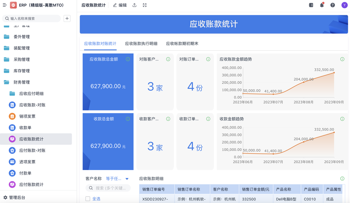 - 财务模块自动生成应收账款,客户打款,财务记账。