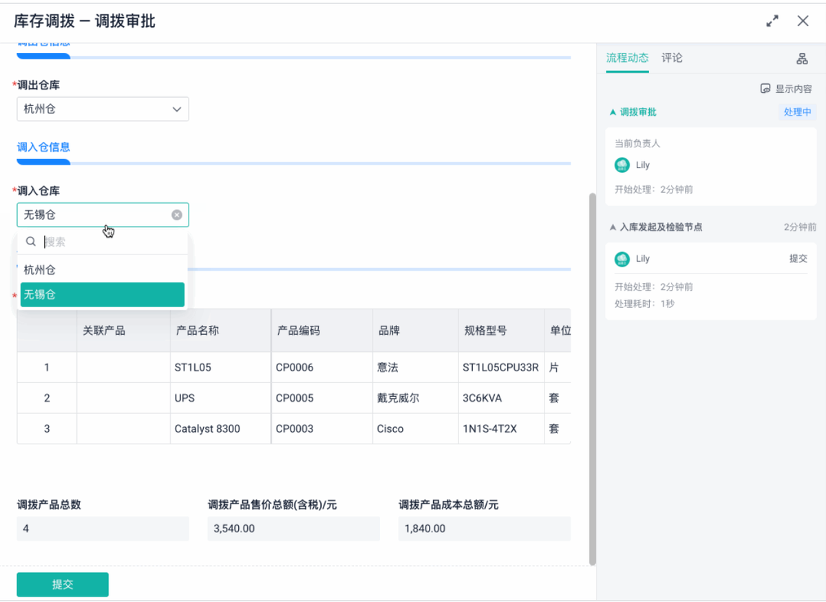 一个仓调另一个仓,系统自动安排任务,记录路径。