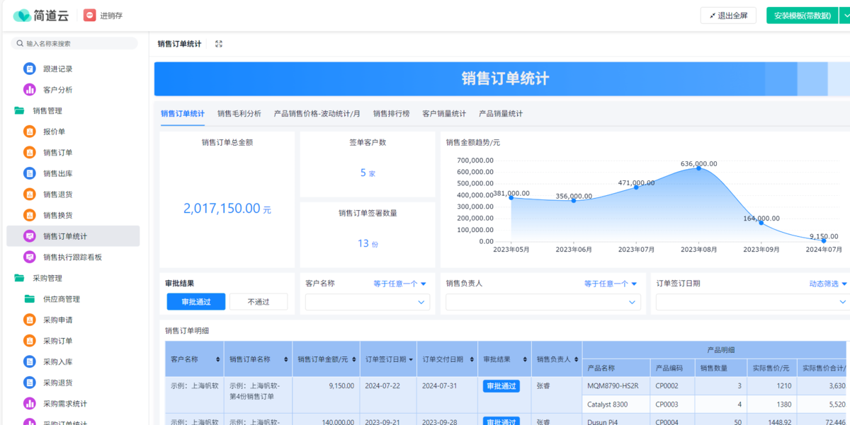 销售管理模块负责跟踪企业的销售订单,包括客户管理、销售订单、发货管理等。通过该模块,企业可以清晰地了解每一笔订单的进展和客户的付款情况。