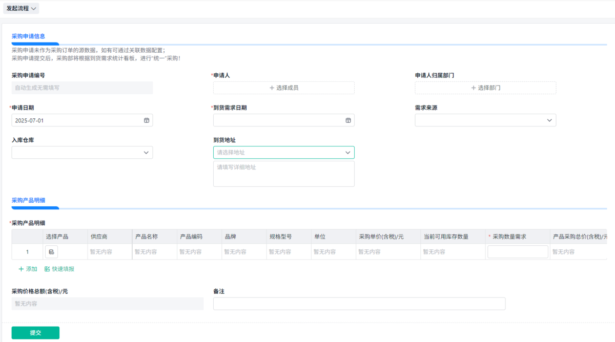 - 申请单生成:内部部门根据需求提交采购申请,明确物料、数量、交货时间等。