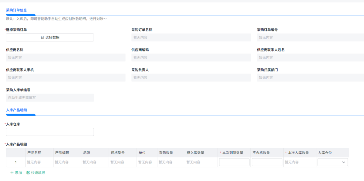 采购入库是确保物料到货、验收并及时入库的过程,主要功能:
