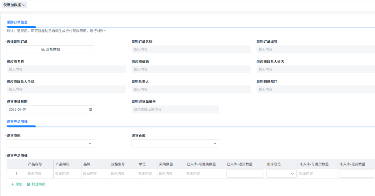 采购退货主要是对不合格或多余的商品进行退回,功能包括:
