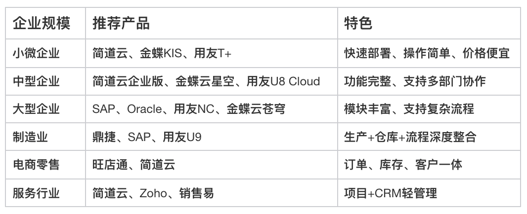 - 推荐:Oracle Netsuite、Microsoft Dynamics、SAP Business One
