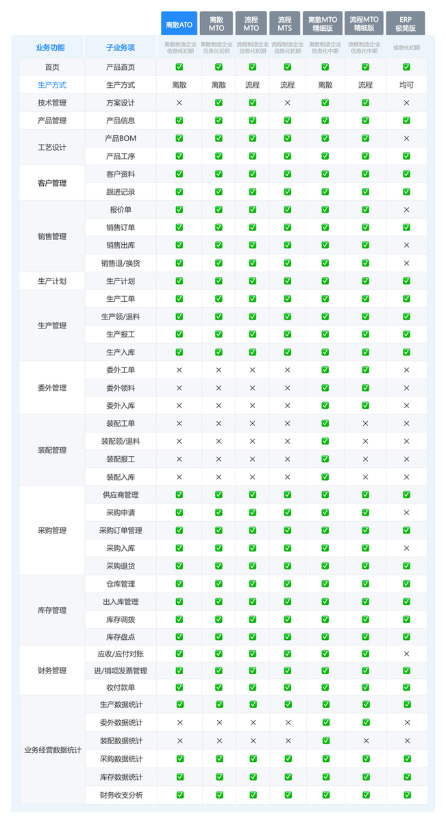 - 9大业务模块:技术管理、客户管理、销售管理、计划管理、生产管理、委外管理、装配管理、采购管理、库存管理、财务管理