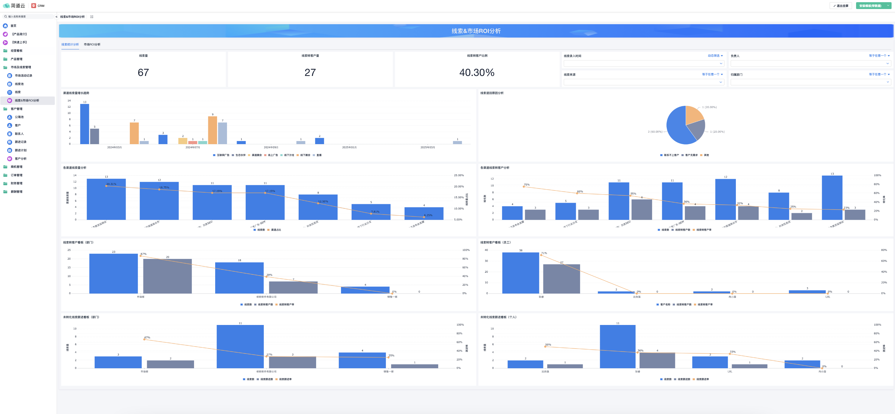 某家B2B软件企业的实践充分证明了数据打通的价值。该公司市场团队之前只能看到线索数量和质量,对后续转化情况一无所知。使用简道云CRM后,市场团队能够清晰看到不同来源线索的销售转化率和客单价,发现虽然行业峰会的线索数量不多,但转化率是线上广告的3倍,客单价高出50%。基于这一洞察,他们重新调整了预算分配,整体营销ROI提升了65%。