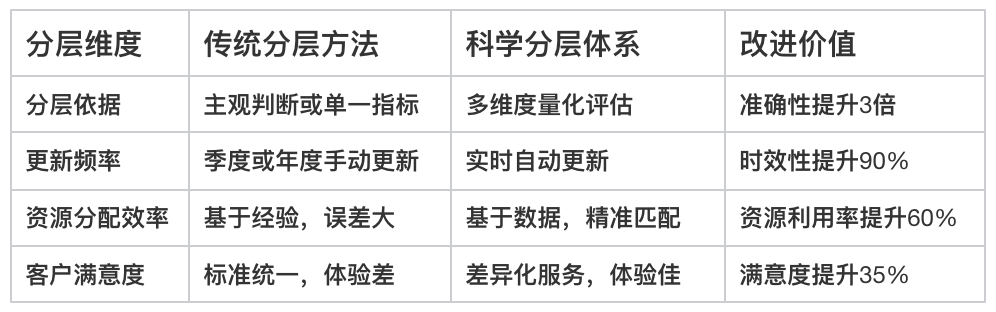 客户数量不多恰恰是实施精细化分层的绝佳时机。相比拥有海量客户的企业,客户数量有限的情况下,实施分层管理的成本和难度更低,而每个客户的价值管理更加重要。在客户基础较小的阶段建立科学的分层体系,能够为未来的规模化发展奠定坚实基础。