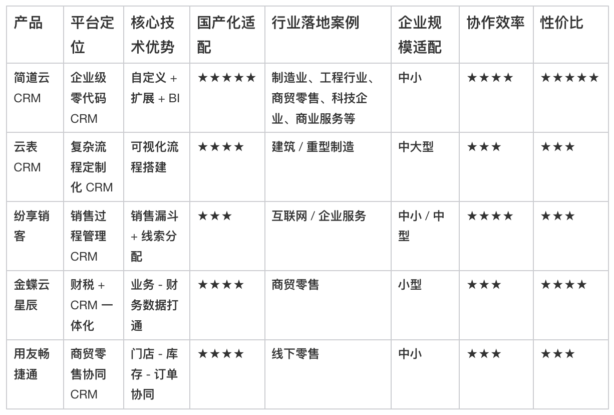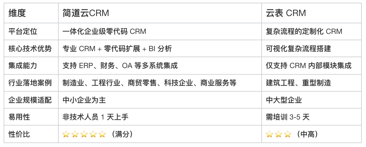 - 企业规模:中小型企业:简道云(快速上线 + 低成本);大型企业:简道云(灵活扩展)或云表 CRM(复杂流程)。