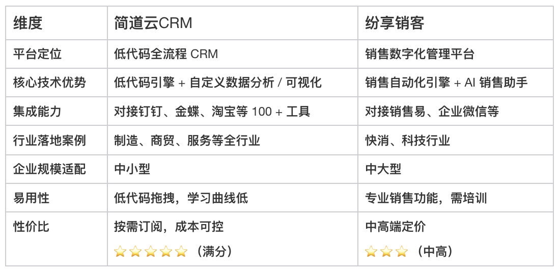 - 中大型企业:选简道云CRM(支持跨部门协同)、纷享销客(销售精细化管理);