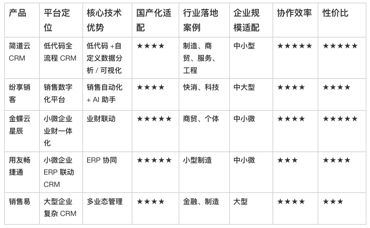 - 中小微企业:选简道云CRM(低代码 + 高性价比)、金蝶云星辰(业财一体化);