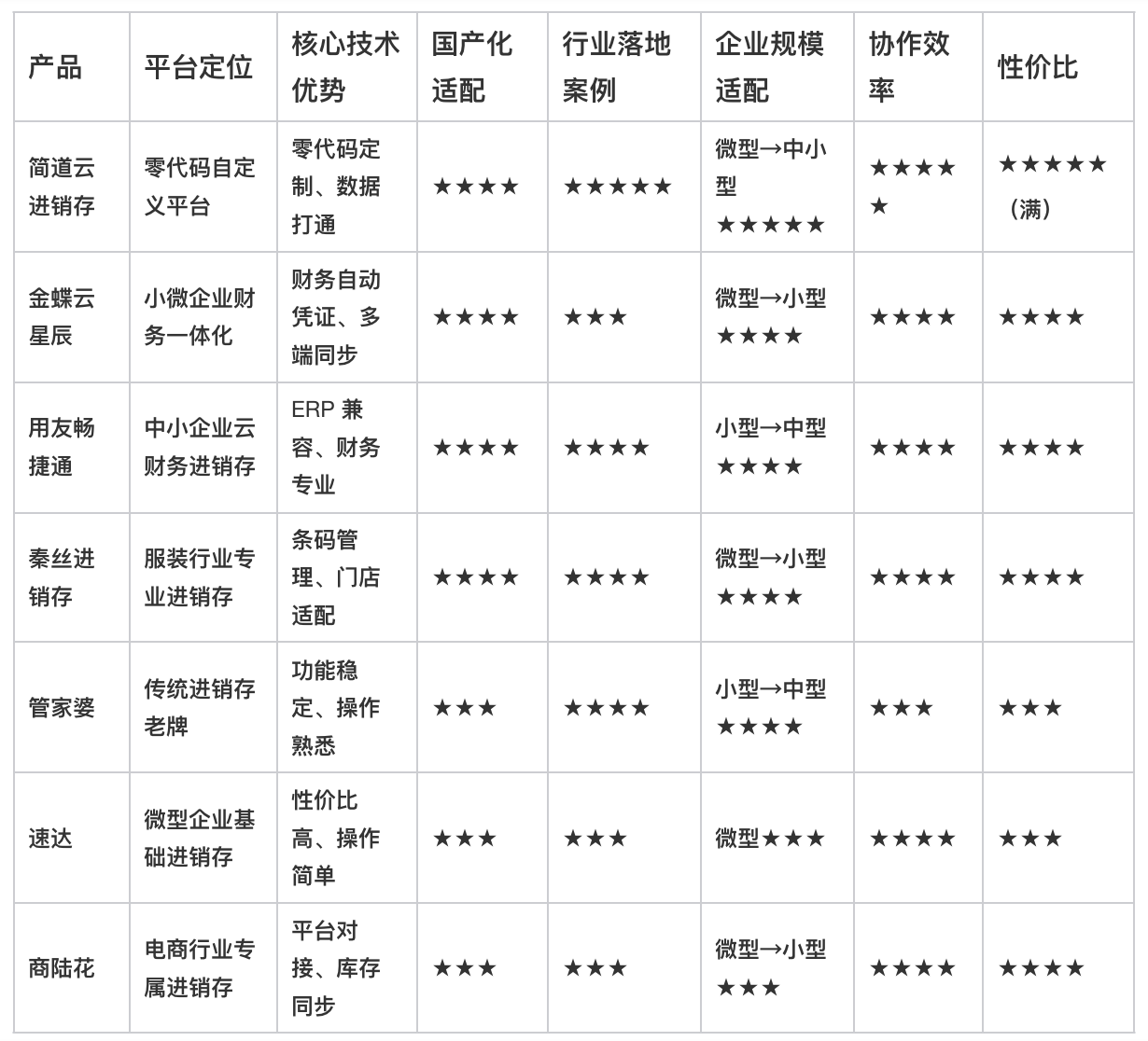 - 速达:性价比极高,适合微型企业(如夫妻店)的基础进销存需求;