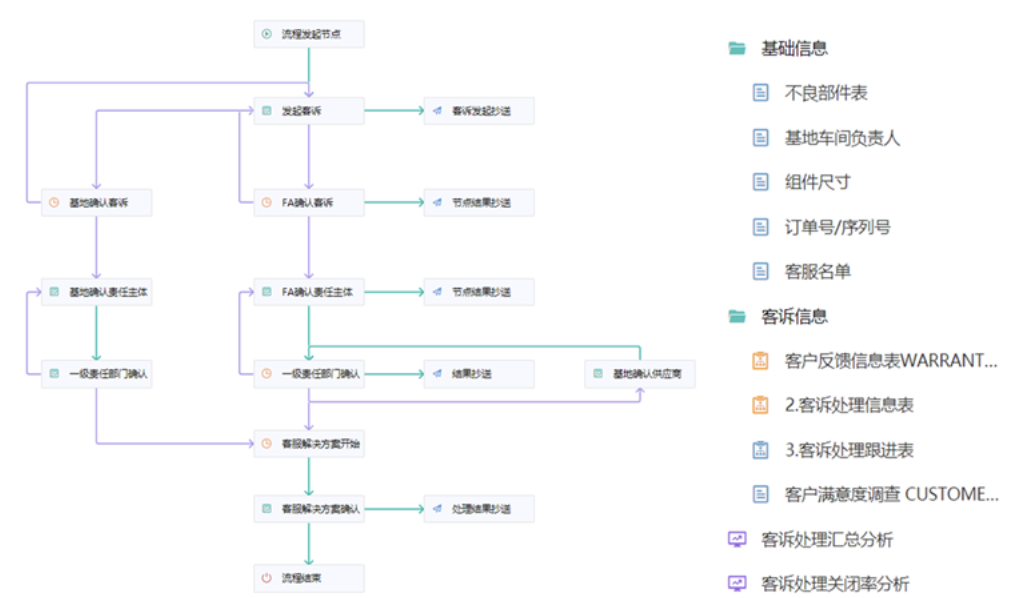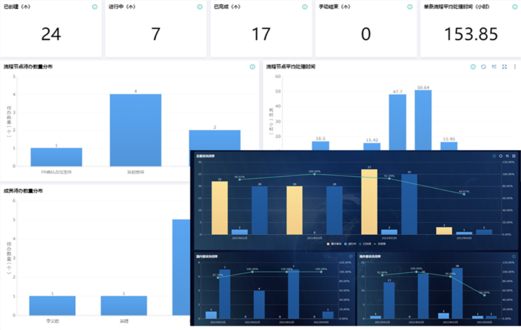 通过BPA和仪表盘对客诉处理过程中的:客诉各环节时效,客诉总处理时效,客诉进度状态,客诉关闭率,客诉投诉原因,客诉责任划分进行分析。