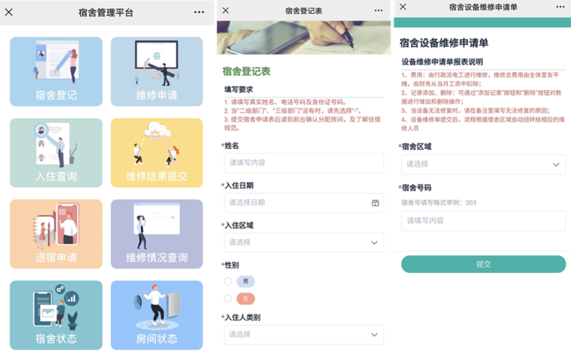 通过这个平台员工可登记入住,也可以提交维修申请。后勤部门可登陆查询宿舍状态、房间状态和维修状况。