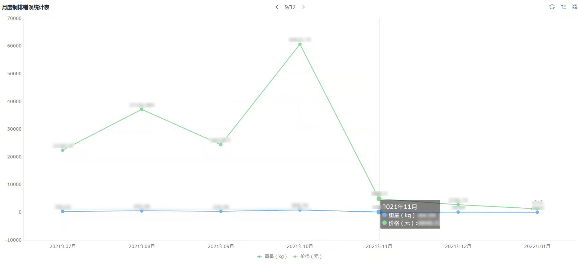 系统上线后,事业部要求工人在加工前填报领料数量、加工后填报铜母线完工数量,其中数量差就是生产废料。 由于废料产生的数据透明、责任到人,月底会自动统计所有人的出错率并挂钩绩效,工人作业时更加小心谨慎,错误率大幅下降。