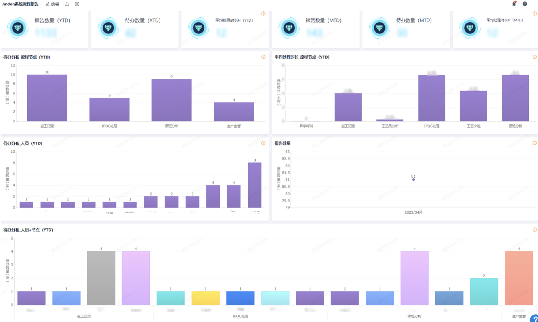 为了便于管理人员掌握事件处理进度,SHVS生产部门基于流程数据上线了安灯看板,展示每一条产线安灯事件的流转率、处理时间等基础信息。