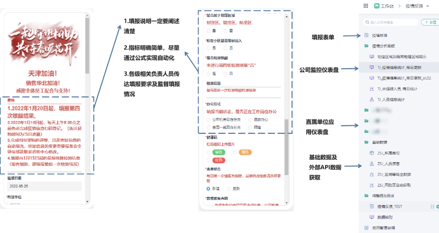 在此情况,在公司领导指示下,相关部门人员及信息人员通力配合在9个小时内完成了基础数据及关键指标收集和梳理,并完成了应用的设计及部署。以“表单公开发布+微信扫码+公共疫情API+数据工厂+仪表盘展示”等功能结合的方式,实现公司每日疫情信息滚动更新及展示,具体应用方法如图4-10至4-11所示。