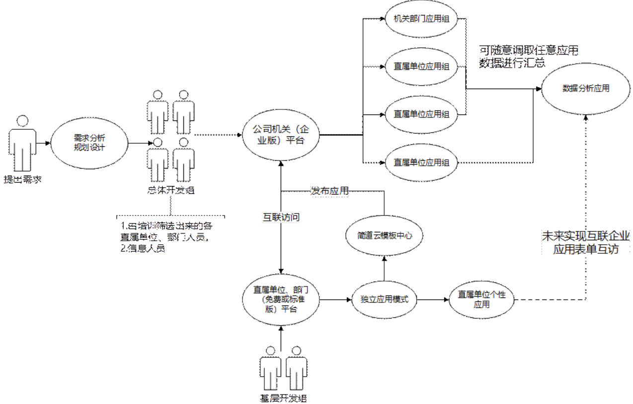 为解决如上问题,合理规划平台应用设计及成本,销售华北分公司零代码团队经过调研和沟通后,领用简道云平台互联功能解决上述问题。即设置公司机关简道云团队与机关部门、直属单位团队二层构架,并进行企业互联,公司机关团队升级为企业级账号,主要应用均部署在此平台上,其他部门和直属单位进行互联,各单位及部门团队账号可依据自身应用情况向公司申请升级付费账号,并部署自用应用。