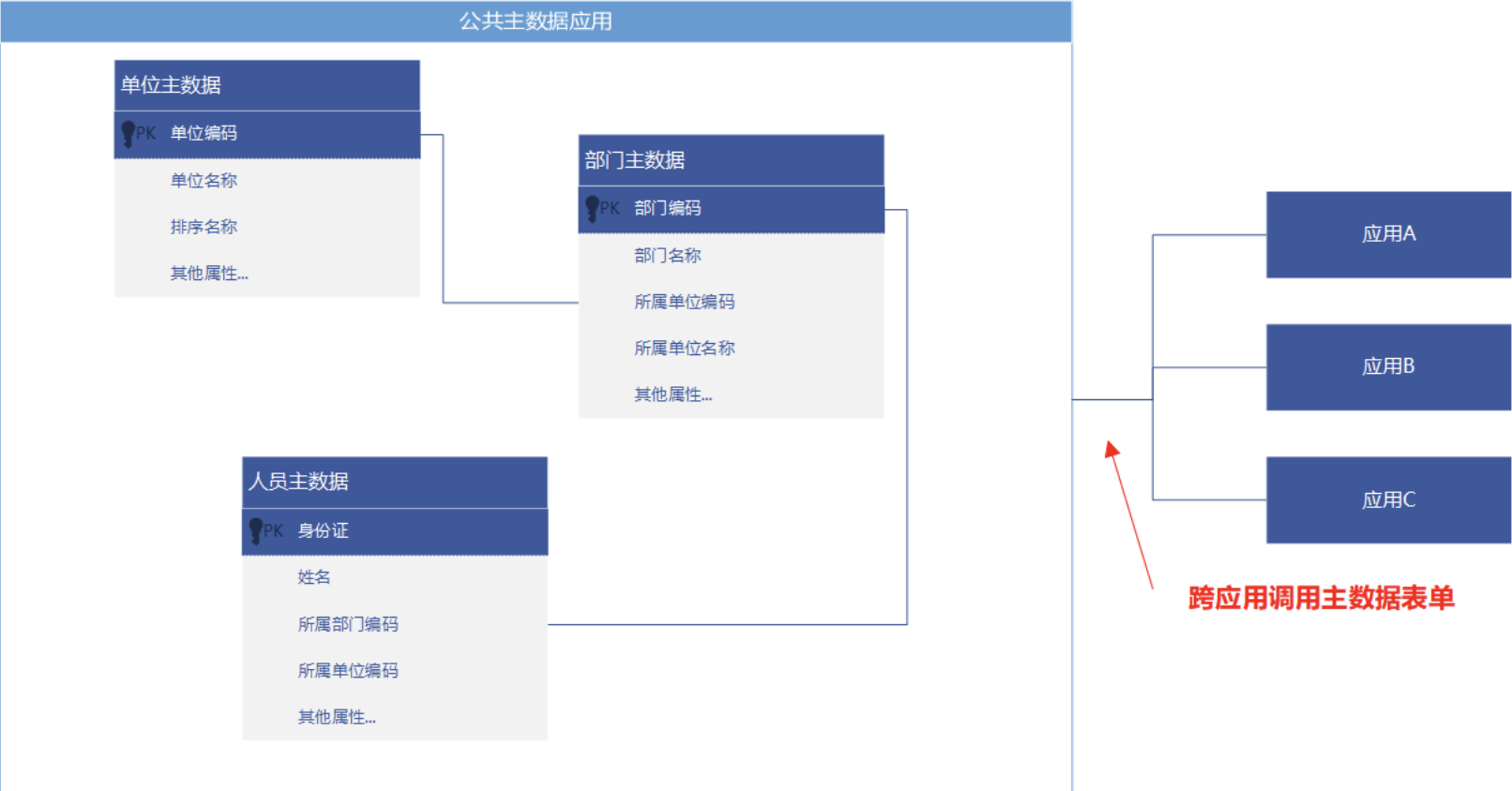 随着零代码团队建设的完善和应用需求的增多,团队在进行需求分析中会发现很多应用相互关联,数据可复用,这样为提升总体的部署效率,需要进行统筹设计,如单位、部门及人员的信息复用率极高,为此设计了公共主数据应用,利用跨应用表单的方式为其他应用所调用,如图4-16所示。