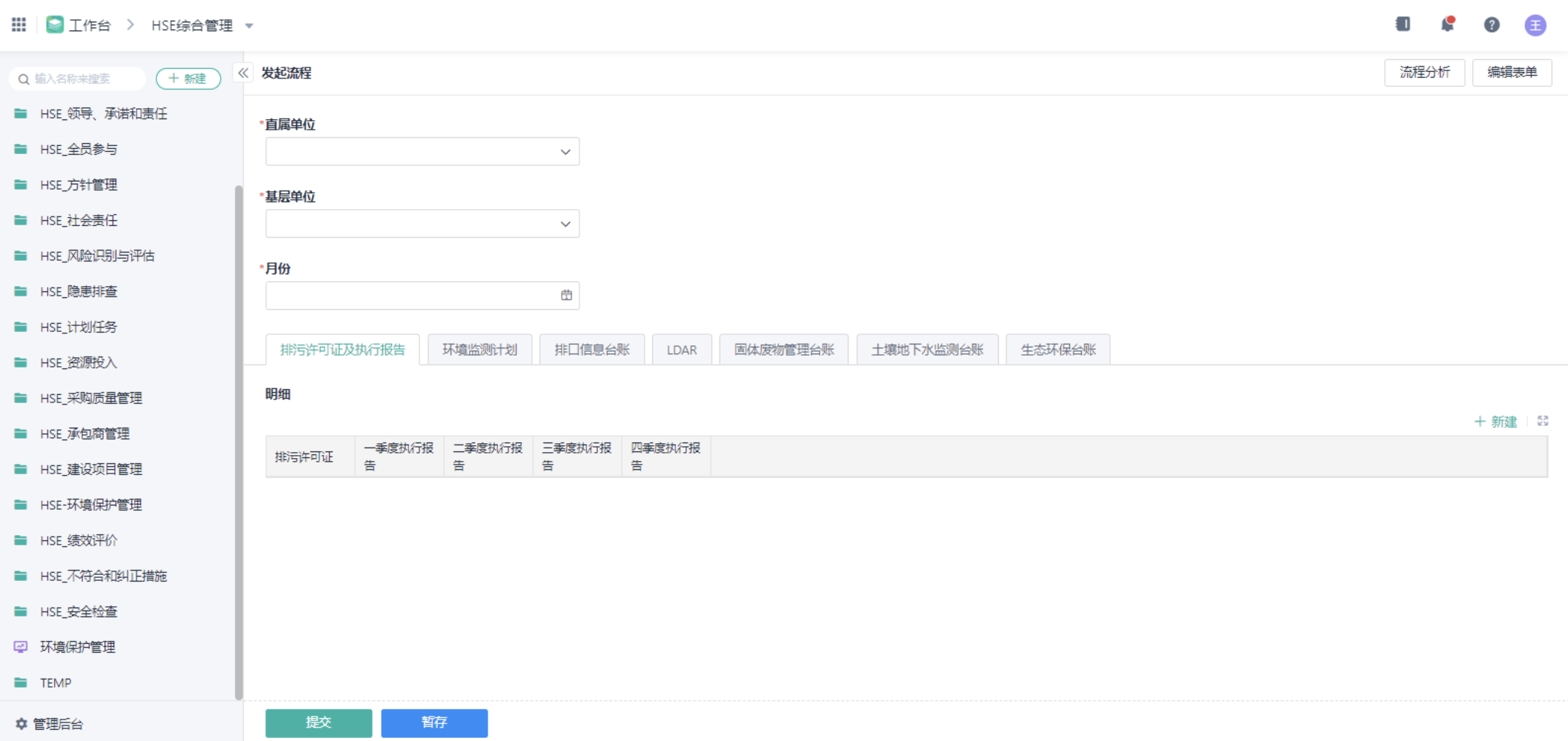 首先对整体HSE体系要素进行分析研究讨论,安排要素的开发计划:那些逻辑复杂、管控节点较多的要素需要制作单独应用,比如设备管理、施工管理、职业健康、碳资产等;那些较为简单的,一个流程或者表单就可以完成的,比如安全承诺书等,汇总为一个综合应用;还有不好界定的暂归类为其他,放置最后处理。