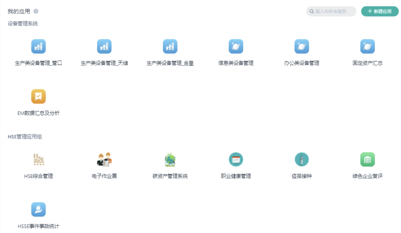 截至2023年,公司和各直属单位累计开发近百个,其中大型企业级应用和应用群集2个,设备管理应用集群、HSE管理应用集群,设备管理应用集群范围覆盖公司机关、直属单位,管理范围涵盖了生产类设备、办公类设备、信息类型设备的管理,HSE管理应用群集,本身涉及管理元素36个,范围涵盖公司各个线条,包含了大小应用及表单22个,如电子作业票系统,职业健康管理、防疫工作这种都是独立应用,综合性的,包含了表单、仪表盘、流程、数据工厂、智能助手、前端事件等等。 并且结合公司自有的门户作为仪表盘的展示入口。