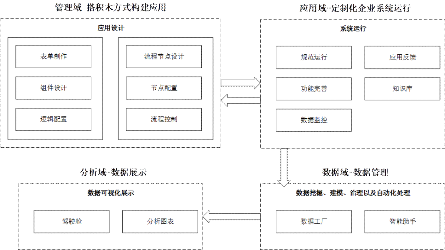 通过上述三个阶段的推进,最终形成了公司零代码平台整体的应用框架,主要划分为四个应用领域,如图3-1所示。