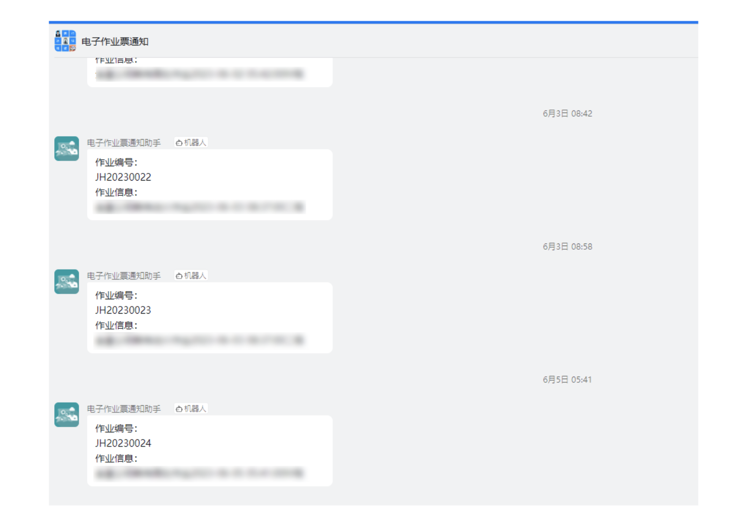 主要是从两个方面入手,一是管理要求,如为配合异常单据处理新增对应的流程表单,再比如优化安全措施签字,原表单设计时候子表单内是无法使用手写签字,这与制定管理要求是不符的,在简道云版本更新后实现了此功能,并利用深化应用的机会进行了调整;二是用户体验,比如根据实际情况对作业时间自动调整功能进行了优化,实现了审核节点处理后更新对应时间点,又比如利用钉钉群机器人插件实现新增及异常单据处理的消息提醒,如图4-21所示。