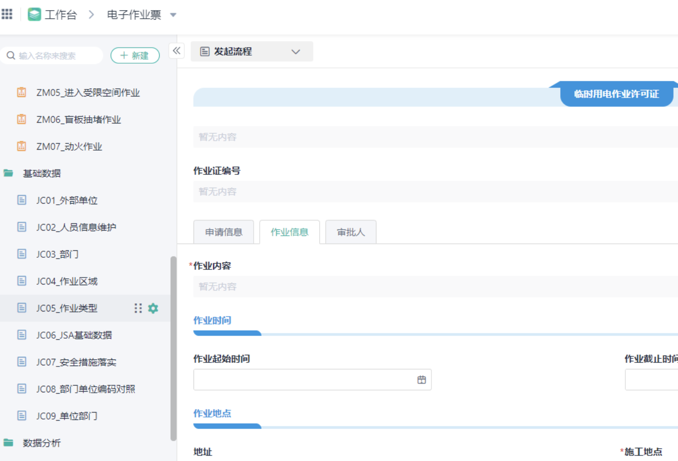 公司原有的施工管理是使用纸质单据进行流转,方式落后,虽然销售华北分公司总部集团公司有相应的统筹规划,但距离落实还需要一定的时间,销售华北分公司基于此情况利用简道云平台,先行开发了电子作业票系统,首先解决现有领域信息化空白的问题,其次为总部统筹实施数字化平台积累应用经验。作业票系统正式实施及投入使用是在公司零代码平台建设的初期,随着应用频率增大,以及相关施工安全制度的调整,系统暴露出来的问题越来越多,单据填报质量不高,存在大量乱填和作废的单据,即没有实现对应管理目标,也没能简化用户的操作。