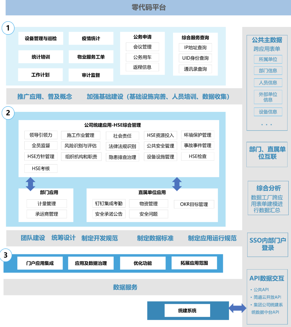 为此公司零代码团队,群策群力,统筹设计,通过对HSE体系要素的分析,制定了“归类划分、综合独立、分步开发、先易后难、统一展示”应用开发方针,并采用周例会制度定期总结和调整。