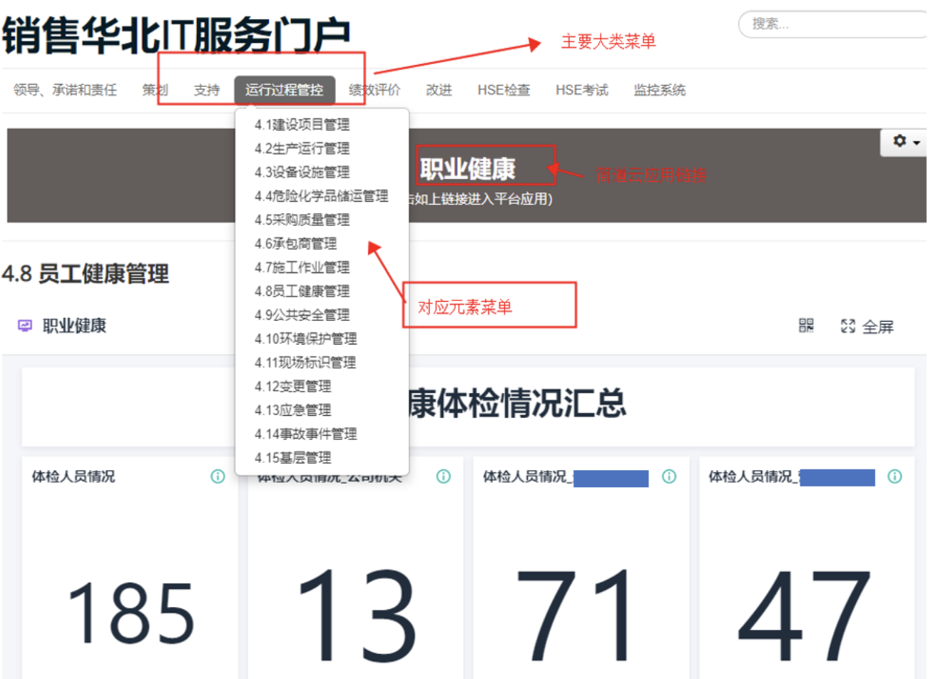 因此,销售华北分公司利用内部基于CMS系统的门户,定制HSE菜单使用嵌入仪表盘的方式,实现了仪表盘展示入口的统一设计,如图4-29所示。