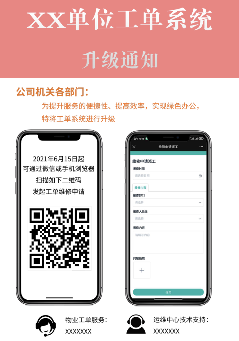 与此同时,制作了应用通知张贴在公司机关各部门办公室内(如图4-8所示),实现维修服务线上流程化,扫码报修, 服务台系统派单,维修人员手机操作单据,客户手写确认。