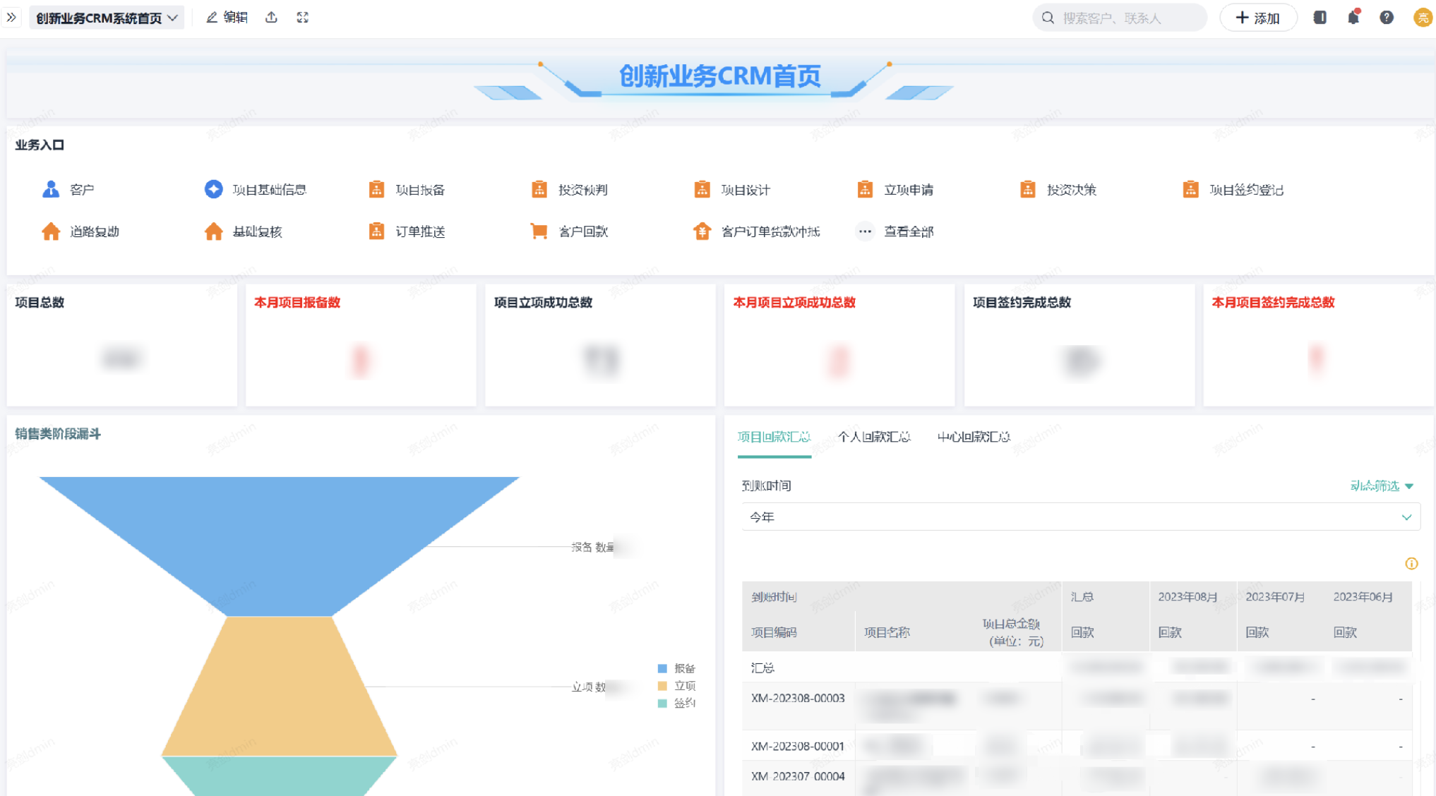 不同于ToC,ToB 业务是项目型管理模式,更关注单体项目的转化情况,需要大量跨部门的协同工作。因此,在CRM系统LTC流程的基础上,远大魔方设计了 ToB CRM 看板。通过下图所示的“异形漏斗”,体现当前各项目的卡点阶段,帮助销售人员了解项目的关键环节有没有突破、技术投标到底能够做到什么程度等信息。